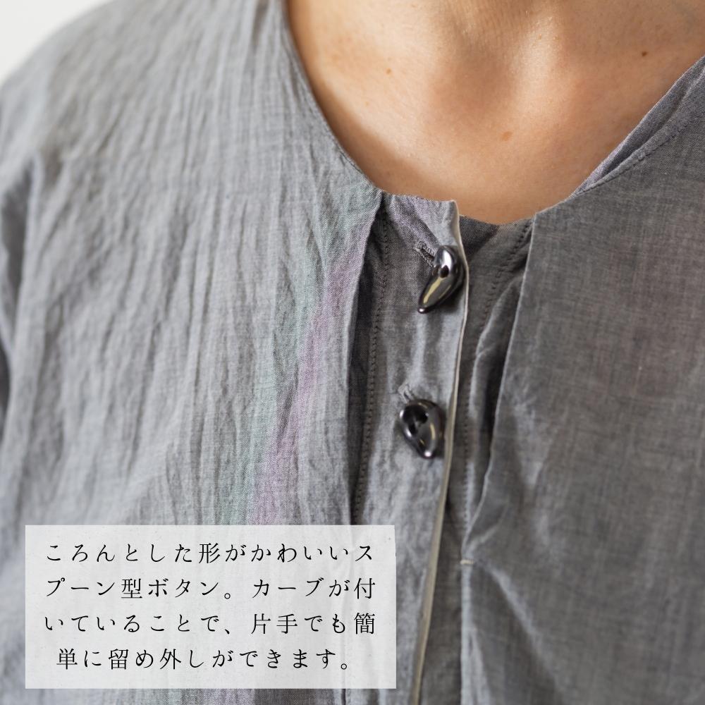 かわいい形の舟形ボタン。先の細いほうからボタンホールに差し込むと、片手で簡単にはめることができます。