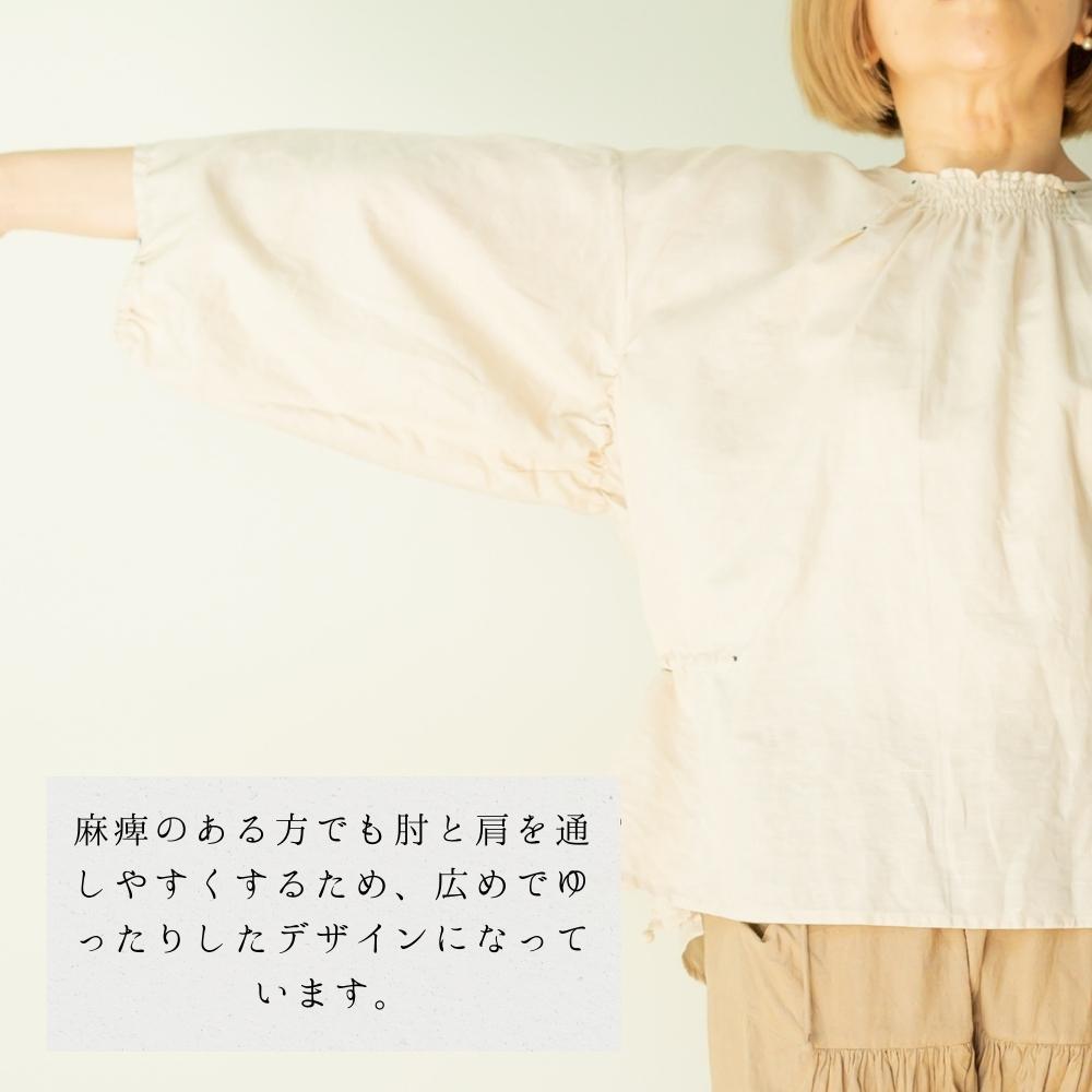 麻痺のある方でも肘と肩を通しやすくするため、広めでゆったりしたデザインになっています