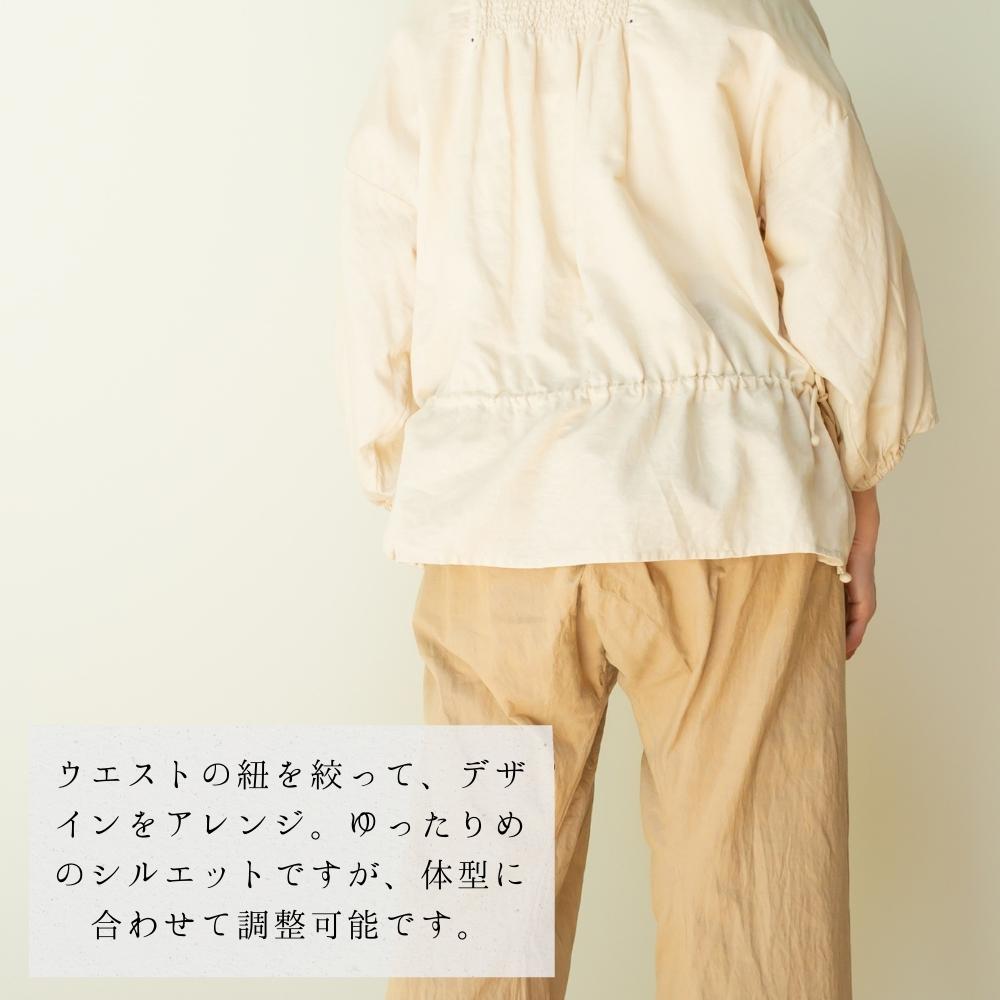 素材としては伸び縮みしないインド綿ですが、シャーリング加工(ゴムを活用した伸縮性のあるデザイン)で、伸縮性を実現。楽にお洋服を着ることが出来ます。