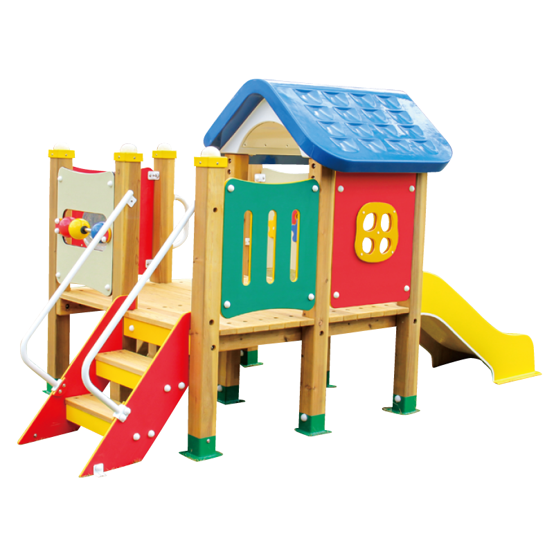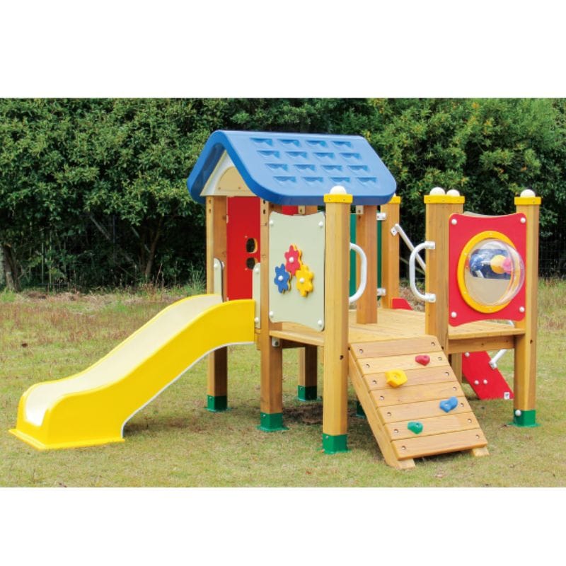 材質: 本体=木製、フレーム・金具類=鉄製、パネル=樹脂製、屋根・柱キャップ・すべり台=FRP製